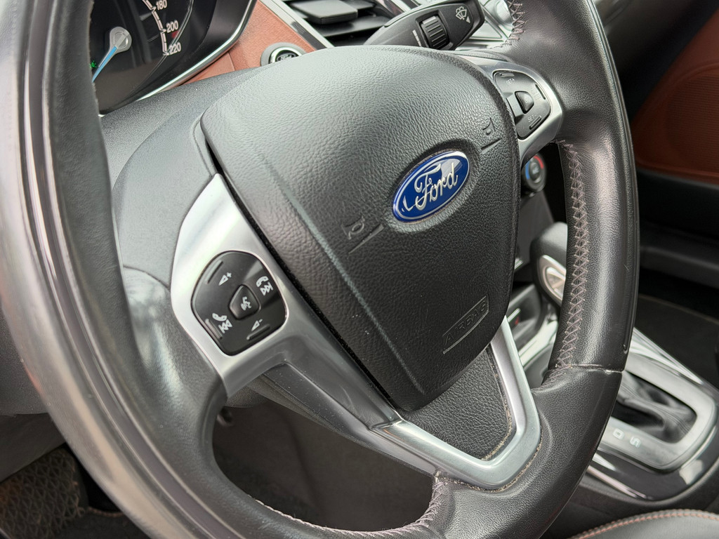 In deze Fiesta vindt u niet alleen schakelaars op het stuur om het navigatiesysteem te bedienen en het audio-installatiesysteem met DAB-ontvangst, maar er is ook spraakbediening. Tot de standaard uitrusting van deze auto hoort ook automatische airconditioning. Met de hulp van de parkeersensoren kost inparkeren en uitparkeren u geen enkele moeite. Het hoort bij een intelligente auto als deze dat hij zelf in staat is om zijn omgeving in de gaten te houden. Dat doet deze Ford met een automatisch inschakelbare verlichting en een regensensor. Voor de lange ritten is de cruise control een verademing. Ook automatisch dimmende binnenspiegel, isofix-aansluiting, centrale deurvergrendeling met afstandsbediening, toerenteller, bagage afdekhoes en bekerhouder zijn aan boord.