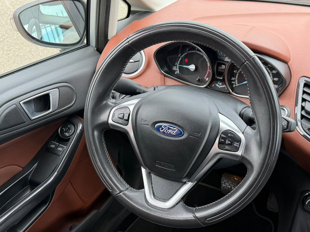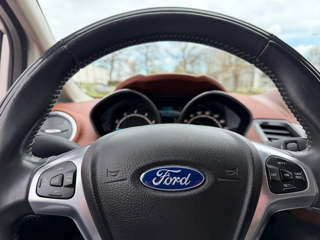 In deze Fiesta vindt u niet alleen schakelaars op het stuur om het navigatiesysteem te bedienen en het audio-installatiesysteem met DAB-ontvangst, maar er is ook spraakbediening. Tot de standaard uitrusting van deze auto hoort ook automatische airconditioning. Met de hulp van de parkeersensoren kost inparkeren en uitparkeren u geen enkele moeite. Het hoort bij een intelligente auto als deze dat hij zelf in staat is om zijn omgeving in de gaten te houden. Dat doet deze Ford met een automatisch inschakelbare verlichting en een regensensor. Voor de lange ritten is de cruise control een verademing. Ook automatisch dimmende binnenspiegel, isofix-aansluiting, centrale deurvergrendeling met afstandsbediening, toerenteller, bagage afdekhoes en bekerhouder zijn aan boord.